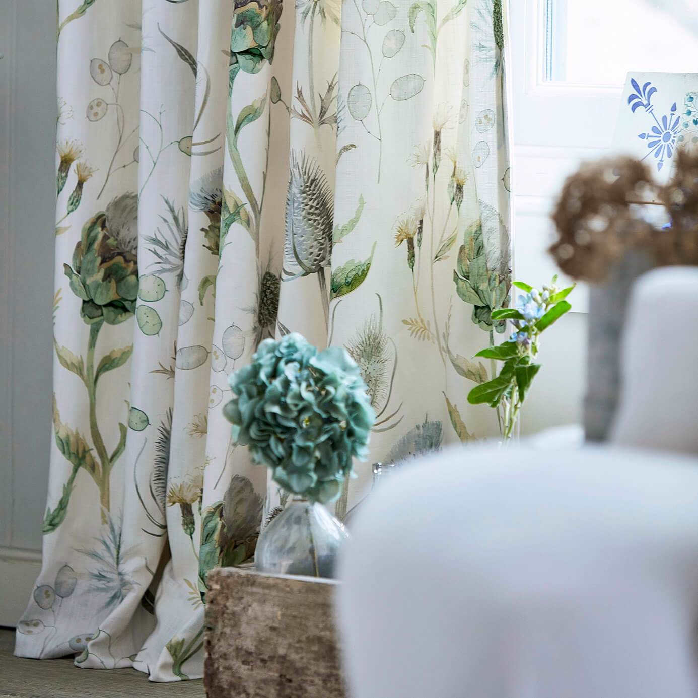 This enchanting cotton-linen mix fabric design portrays strong thistle shapes alongside delicate seedpods and punctuated by lively bursts of colour.