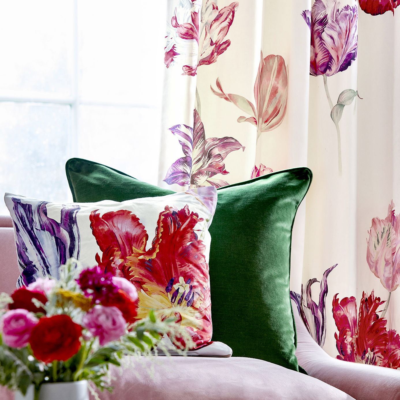 A spectacular watercolour painting celebrating the beauty and diversity of tulips in full bloom, Tulipomania is available on cotton satin in a stunning naturalistic colour.