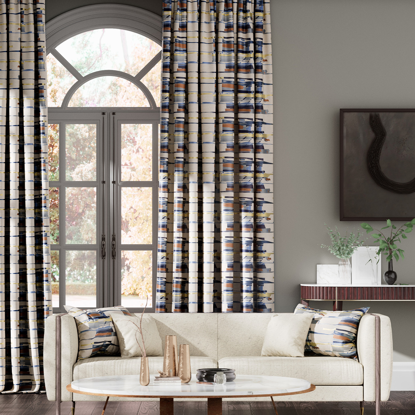 Maľovaná výšivka z ľanovej zmesi pripomínajúca abstraktné štetcové ťahy v dekonštruovanom vodorovnom pruhu v tónových farebných vyhotoveniach. Nádherne sa hodí na žalúzie, vankúše a záclony.